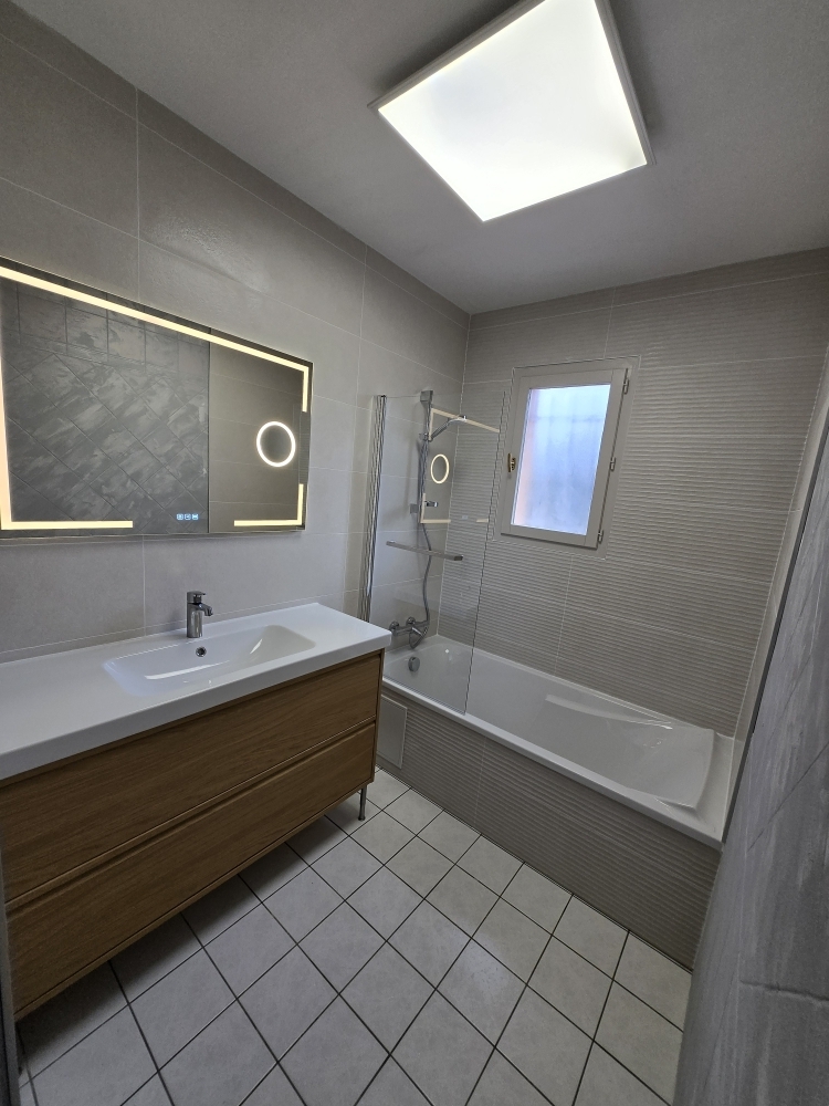 Zoomer 24-10-2024 Remplacement d'une baignoire à Lachassagne avec reprise des faiences et pose d'un meuble vasque.